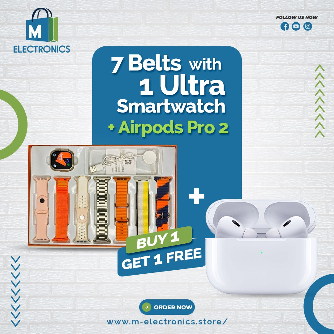 Buy 1 get 1 Combo ( Airpods Pro 2 (2nd Generation) + 7 Belts With 1 Ultra Smartwatch