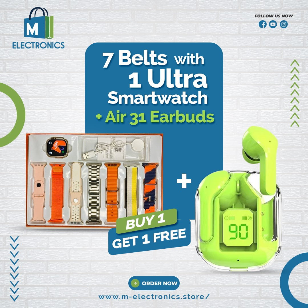 7 Belts With 1 Ultra Smartwatch + Air 31 Earbuds