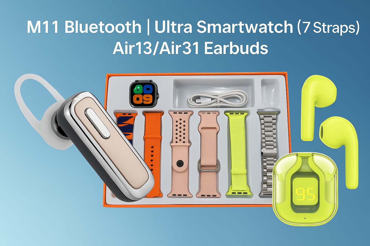 10 in - 1 Gadget Combo | 1 M11 Bluetooth | 1 Smart Watch |7 Belt | 1 Air 13 Earbuds